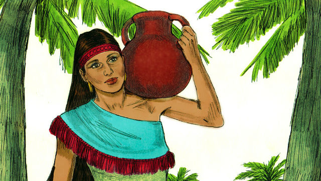 Antes que ele acabasse de falar, eis que Rebeca, filha de Betuel, filho de Milca, mulher de Naor, irmão de Abraão, saía com o seu cântaro sobre o ombro. A donzela era muito formosa à vista, virgem, a quem varão não havia conhecido; ela desceu à fonte, encheu o seu cântaro e subiu. Então o servo correu-lhe ao encontro, e disse: Deixa-me beber, peço-te, um pouco de água do teu cântaro. Respondeu ela: Bebe, meu senhor. Então com presteza abaixou o seu cântaro sobre a mão e deu-lhe de beber. E quando acabou de lhe dar de beber, disse: Tirarei também água para os teus camelos, até que acabem de beber. Também com presteza despejou o seu cântaro no bebedouro e, correndo outra vez ao poço, tirou água para todos os camelos dele. E o homem a contemplava atentamente, em silêncio, para saber se o Senhor havia tornado próspera a sua jornada, ou não.