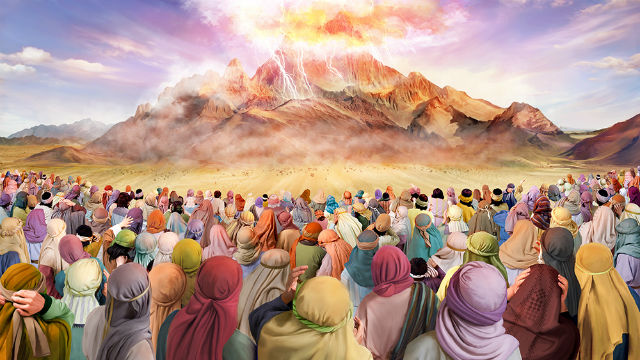Ao terceiro dia, ao amanhecer, houve trovões, relâmpagos, e uma nuvem espessa sobre o monte; e ouviu-se um sonido de buzina mui forte, de maneira que todo o povo que estava no arraial estremeceu. E Moisés levou o povo fora do arraial ao encontro de Deus; e puseram-se ao pé do monte.