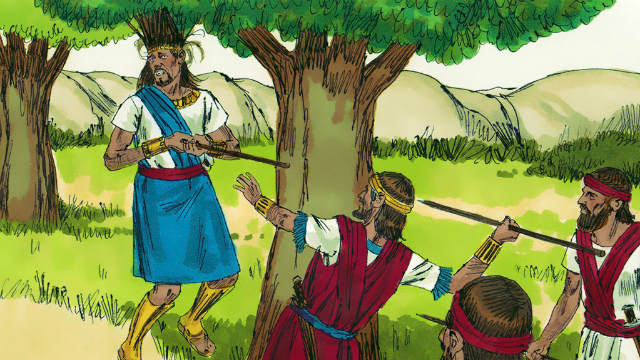 Por acaso Absalão se encontrou com os servos de Davi; e Absalão ia montado num mulo e, entrando o mulo debaixo dos espessos ramos de um grande carvalho, pegou-se a cabeça de Absalão no carvalho, e ele ficou pendurado entre o céu e a terra; e o mulo que estava debaixo dele passou adiante. um homem, vendo isso, contou-o a Joabe, dizendo: Eis que vi Absalão pendurado dum carvalho. Então disse Joabe ao homem que lho contara: Pois que o viste, por que não o derrubaste logo por terra? E eu te haveria dado dez siclos de prata e um cinto. Respondeu, porém, o homem a Joabe: Ainda que eu pudesse pesar nas minhas mãos mil siclos de prata, não estenderia a mão contra o filho do rei; pois bem ouvimos que o rei deu ordem a ti, e a Abisai, e a Itai, dizendo: Guardai-vos, cada um, de tocar no mancebo Absalão. E se eu tivesse procedido falsamente contra a sua vida, coisa nenhuma se esconderia ao rei, e tu mesmo te oporias a mim: Então disse Joabe: Não posso demorar-me assim contigo aqui. E tomou na mão três dardos, e traspassou com eles o coração de Absalão, estando ele ainda vivo no meio do carvalho. E o cercaram dez mancebos, que levavam as armas de Joabe; e feriram a Absalão, e o mataram.