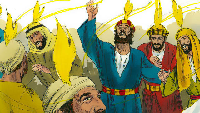Ao cumprir-se o dia de Pentecostes, estavam todos reunidos no mesmo lugar. De repente veio do céu um ruído, como que de um vento impetuoso, e encheu toda a casa onde estavam sentados. E lhes apareceram umas línguas como que de fogo, que se distribuíam, e sobre cada um deles pousou uma. E todos ficaram cheios do Espírito Santo, e começaram a falar noutras línguas, conforme o Espírito lhes concedia que falassem.
